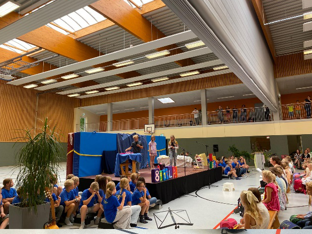 Zu dieser Einschulung hatten die Schülerinnen und Schüler der 4. Klassen gemeinsam mit ihren Klassenlehrerinnen das Mini-Musical „Ach du meine Tüte“ eingeübt. Die Begeisterung der kleinen Darsteller sprang sofort auf die Zuschauer und die neuen Schülerinnen und Schüler über, die am Ende der Vorführungen begeistert applaudierten.