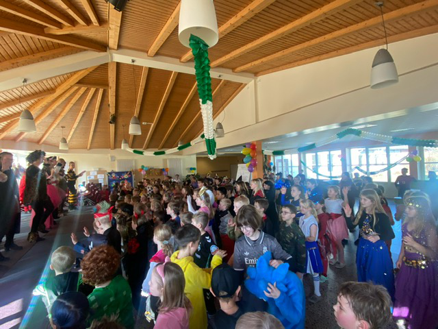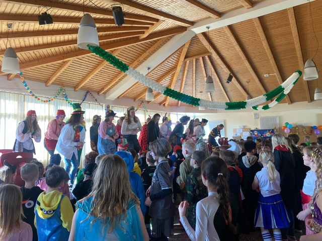 Ein besonderes Highlight war die fröhliche Polonaise durch das gesamte Schulgebäude, die in der festlich geschmückten Pausenhalle endete. Dort erwartete die Schülerinnen und Schüler eine besondere Überraschung: Das gesamte Schulteam führte eigens für diesen Anlass einstudierte Tänze auf und animierten alle zum Mitmachen. Die Pausenhalle verwandelte sich in eine riesige Tanzfläche, auf der ausgelassen gefeiert wurde.