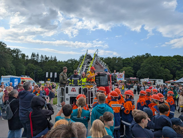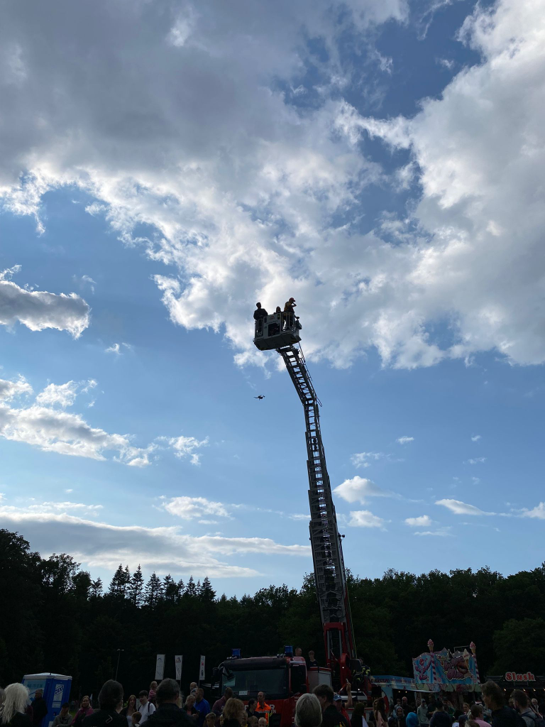 Bereits der Auftakt zur Veranstaltung war ein echtes Highlight: Unsere Schulleiterin Birgit Arnoldt durfte den offiziellen Startschuss geben – und das nicht vom Boden aus, sondern von einer Feuerwehrdrehleiter in rund 25 Metern Höhe! Ein unvergesslicher Moment für alle Beteiligten, der den Start der Märsche gebührend einläutete.