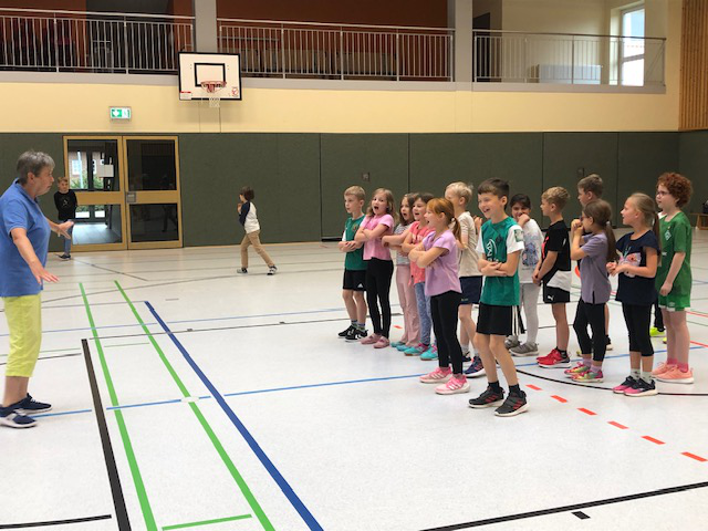 Ein besonderes Highlight war das sportliche Showprogramm, das die Schülerinnen und Schüler der vierten Klassen gemeinsam mit ihrem Sportlehrer vorbereitet hatten. Mit viel Schwung, Energie und Freude zeigten die Kinder eine abwechslungsreiche Vorführung, die das Publikum begeisterte. Die Darbietung unterstrich einmal mehr, warum unsere Schule stolz den Titel „Sportfreundliche Schule“ trägt.