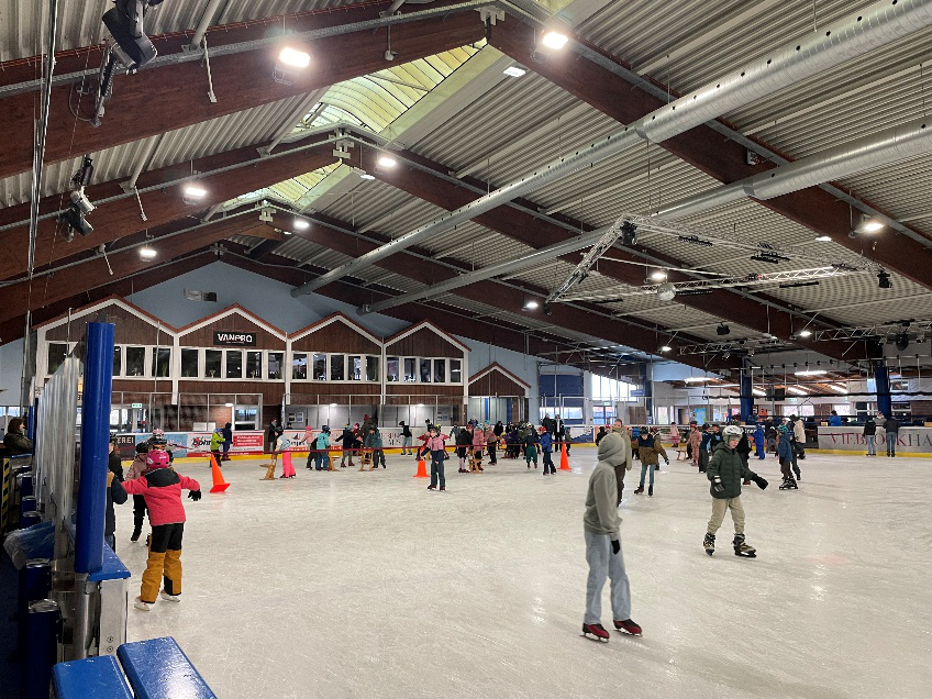 Nachdem alle ihre Schlittschuhe angezogen hatten, wagten sie sich auf die glatte Fläche, die für manche zunächst eine echte Herausforderung darstellte. Für Anfängerinnen und Anfänger gab es einen abgetrennten Bereich, in dem sie mit Unterstützung von Begleitpersonen oder mithilfe von Stühlen ihre ersten Schritte üben konnten. Auf der großen Eisfläche drehten die geübteren Kinder bereits sicher ihre Runden. Viele der anfänglich noch zögerlichen Kinder fassten nach einigem Üben Mut und trauten sich schon bald auf die große Bahn.